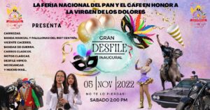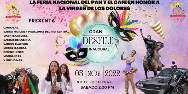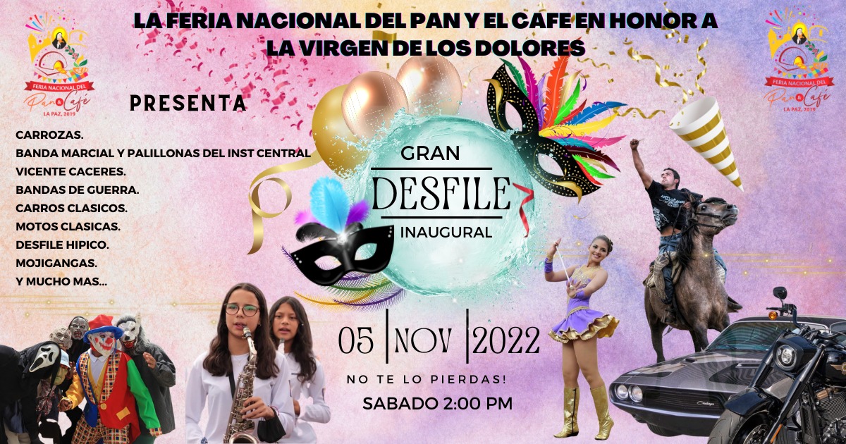 La Feria Nacional del Pan y Café La Paz 2022 en honor a la Virgen de los Dolores. Te invita a su Gran desfile inaugural, este sábado 5 de noviembre a partir de las 2:00pm. Animado por la banda Marcial y Palillonas del Inst. Central Vicente Cáceres, desfile hípico, bandas de guerras, mojigangas, carrozas, carros clásico, motos clásicas y mucho mas!!!